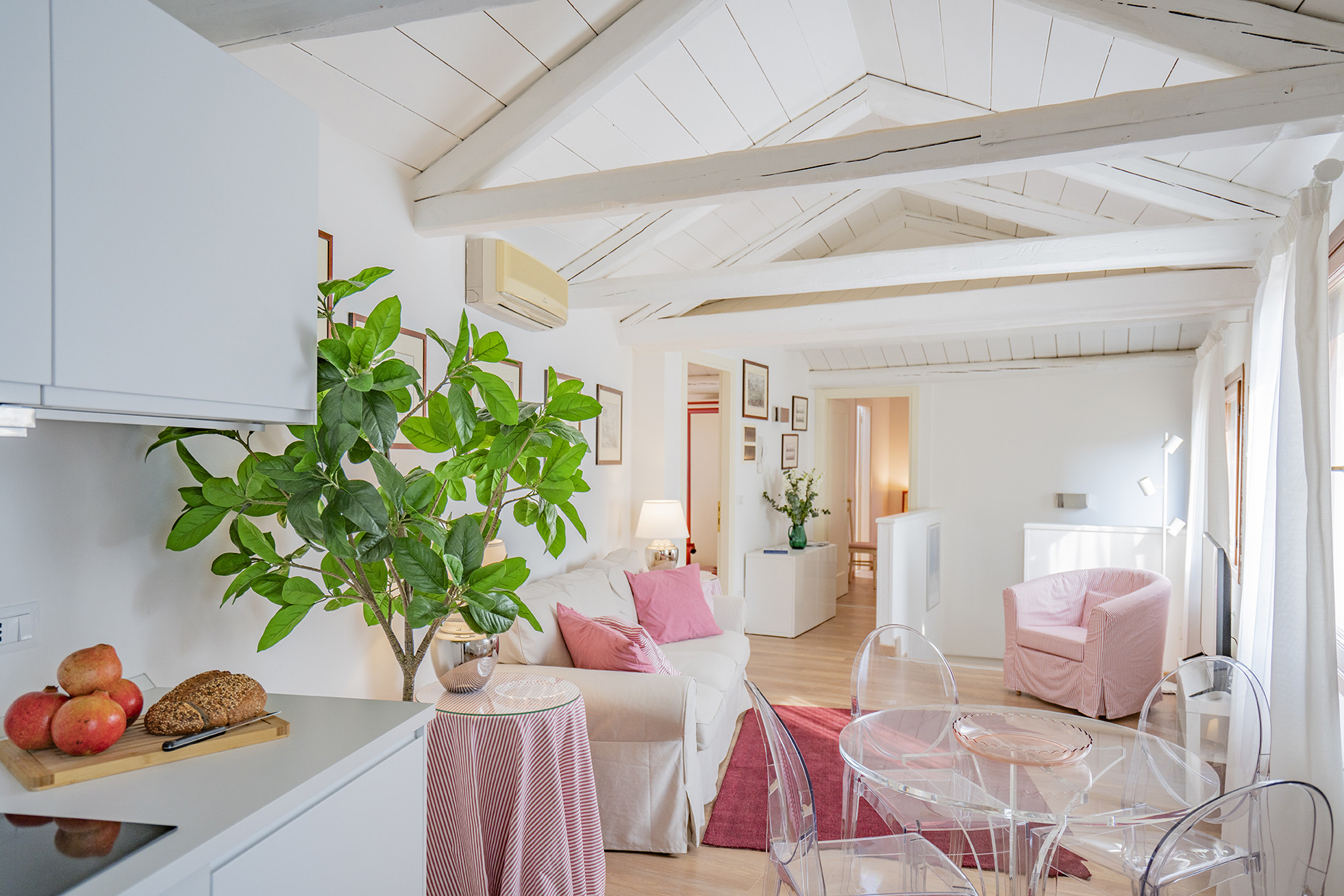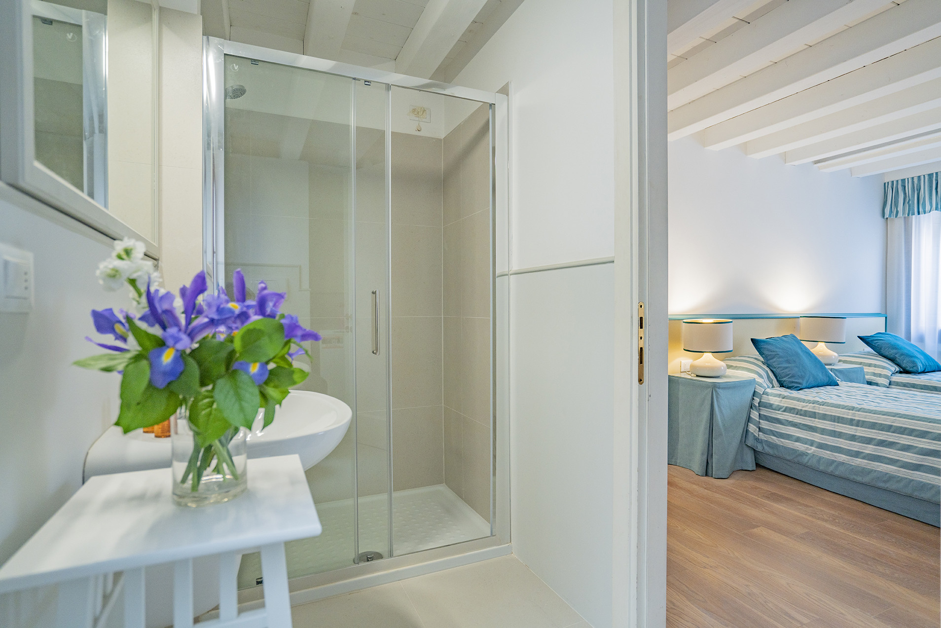 Showcasing a harmonious blend of whitewashed beams, wooden floors and a palette of co-ordinated colours resulting in a relaxed and easy-going vibe, the fully air-conditioned** Ca’ Dei Musicanti apartments offer en suite bathrooms throughout along with Wi-Fi and a washing machine.