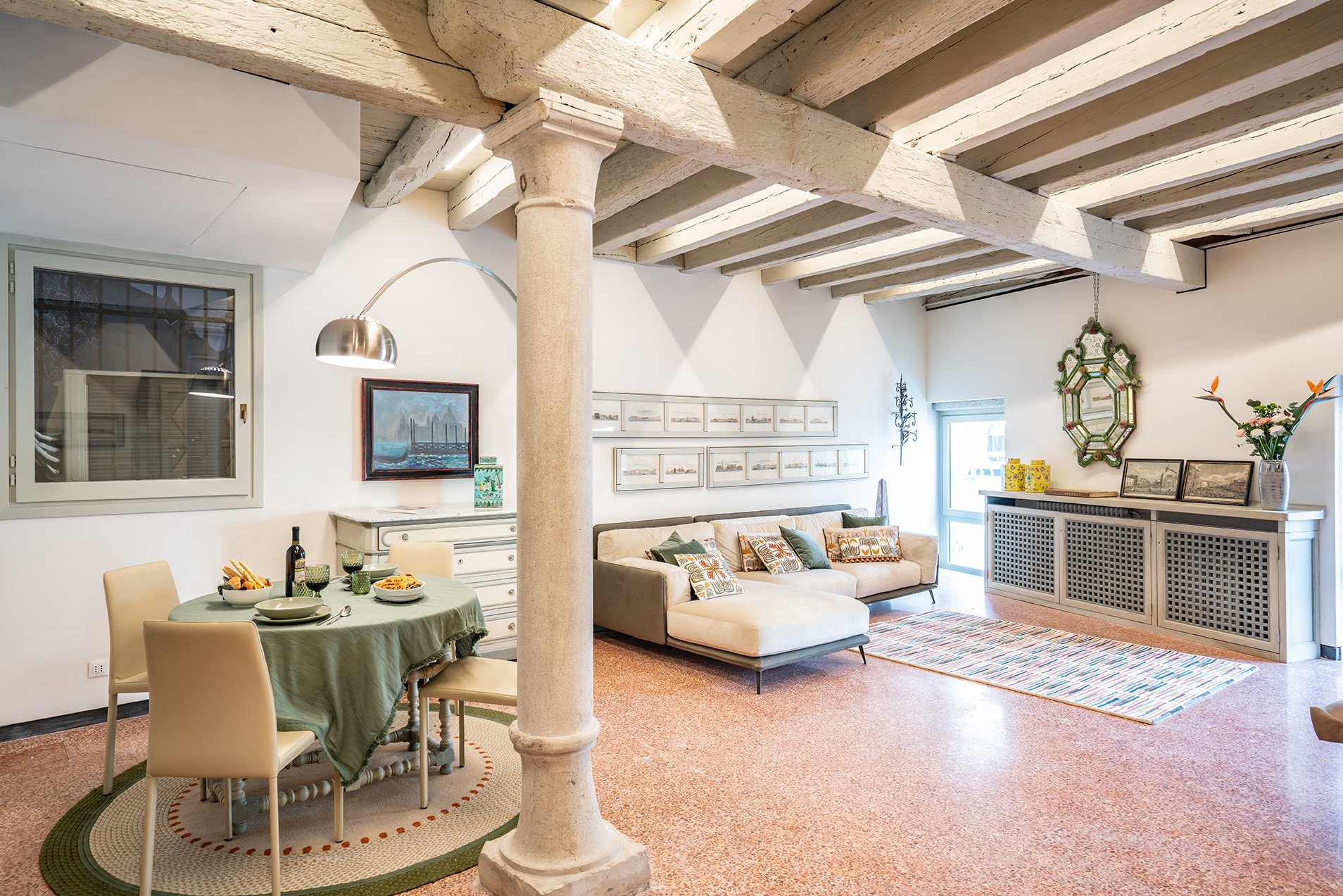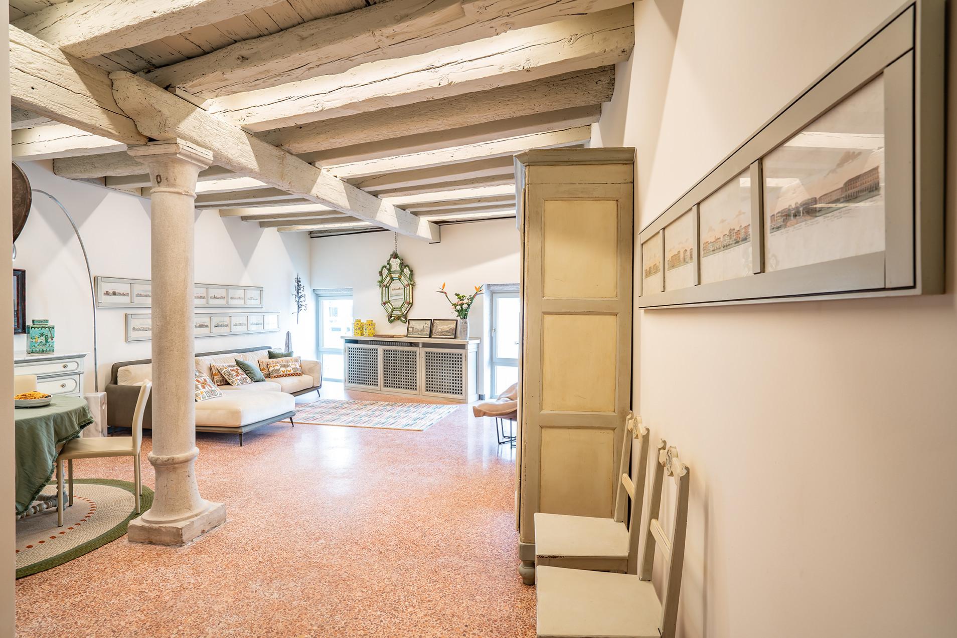 Eine stilvolle und einladende Wohnung im Loft-Stil mit fantastischen Holzbalken und einer Dachterrasse „Altana“, beneidenswert nur wenige Schritte vom Palazzo Grassi entfernt im gehobenen Stadtteil San Samuele, direkt am Campo Santo Stefano.