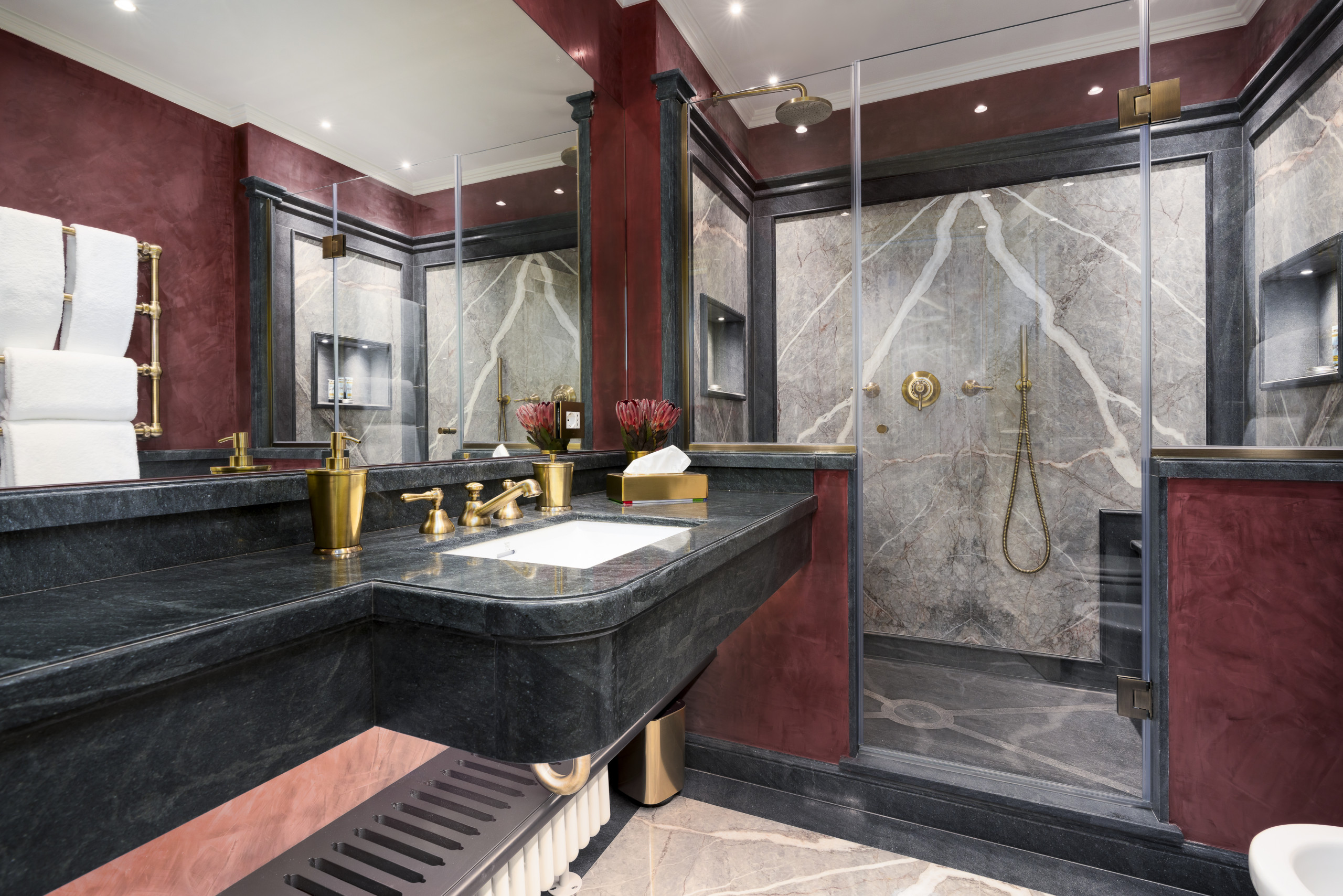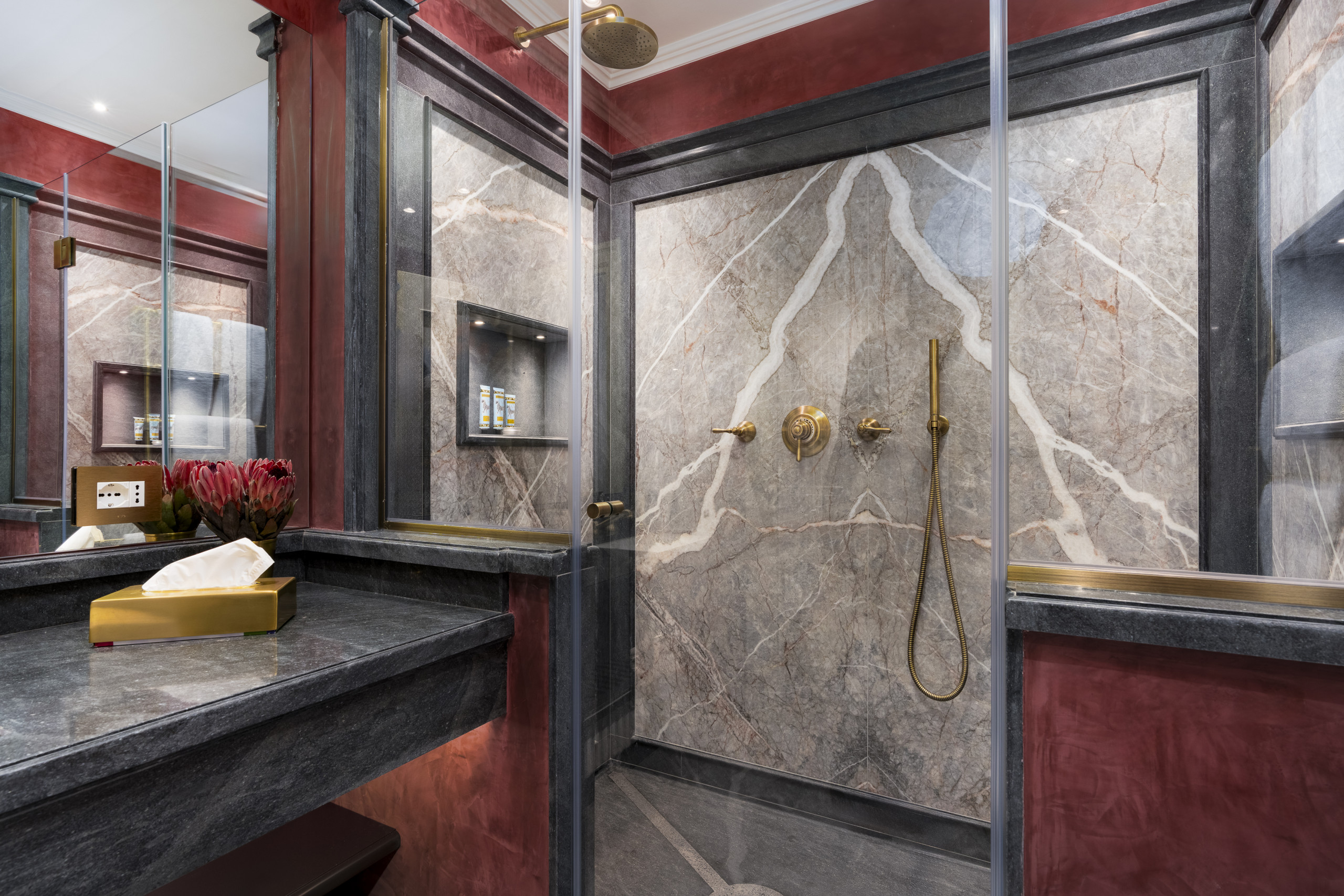 Situated to the centre of the apartment and rather smaller in size but just as memorable in personality, the characterful 2nd double bedroom in toasty cannella and frothy cappuccino colours with a luxurious double bed, a pair of slim wardrobes, and a deluxe en suite bathroom in cordovan-red marmorino with burnished brass fittings and large shower in bookmatched marble