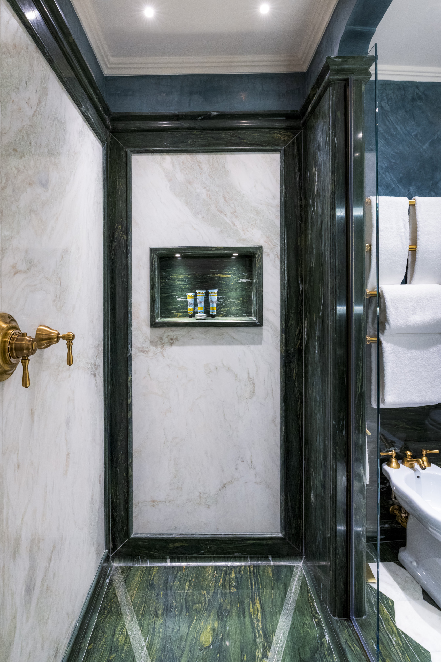 Custom-made by traditional Florentine woodworking specialists Falegnameria Matulli, the smart kitchen area with marble worktop is streamlined, uncluttered and features top-of the-range integrated appliances (including the ever-essential wine cooler cabinet), a groovy bespoke brass breakfast bar with matching stools where you can keep your personal chef company**, and a cleverly angled mirror overhead reflecting the light from the sparkling Grand Canal waters beyond... it’s the ‘place to be’ for evening aperitivi – just ask Filippo!