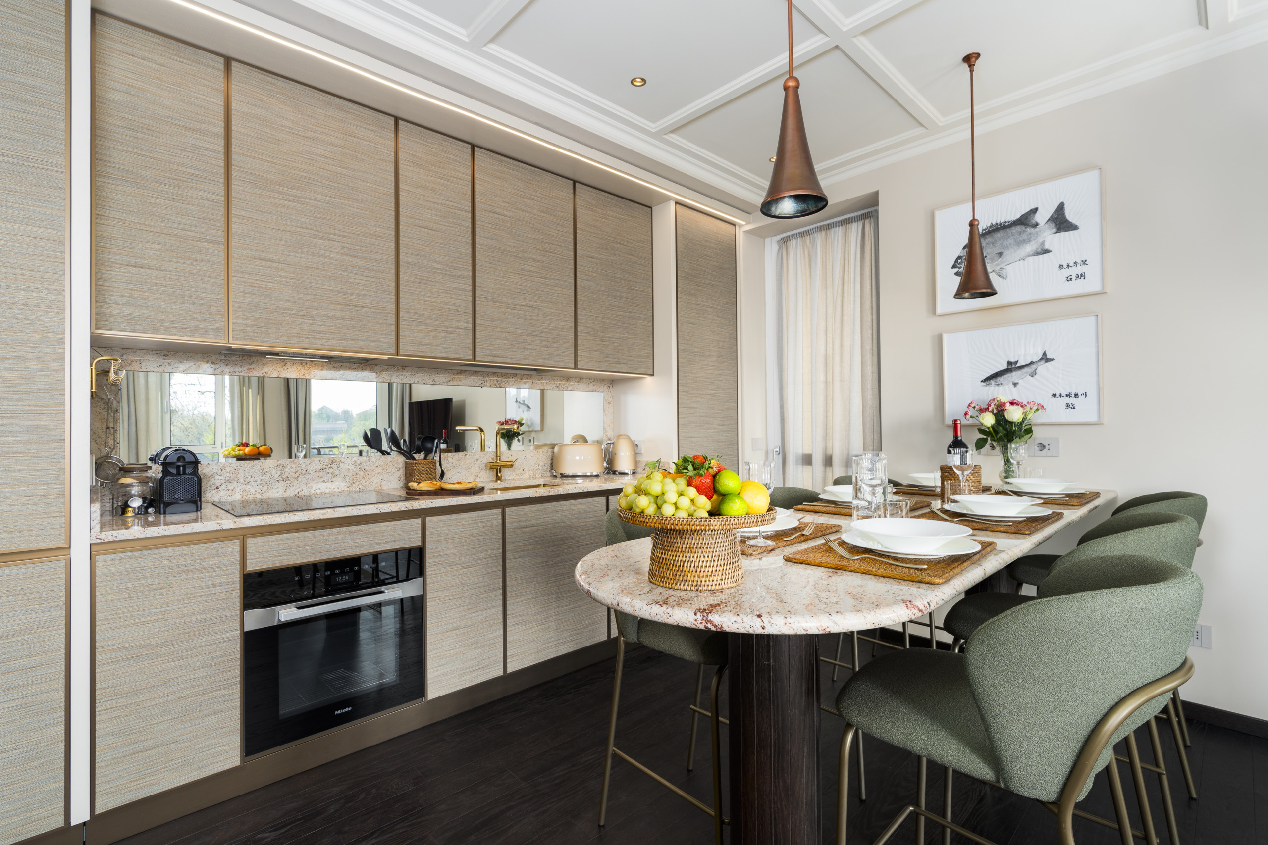 Une cuisine / salle à manger artisanale, bien équipée avec des appareils intégrés (dont un réfrigérateur à vin – essentiel !), des plans de travail en marbre avec des miroirs en fond, une table ronde pour 4 personnes et une porte vitrée menant à la...