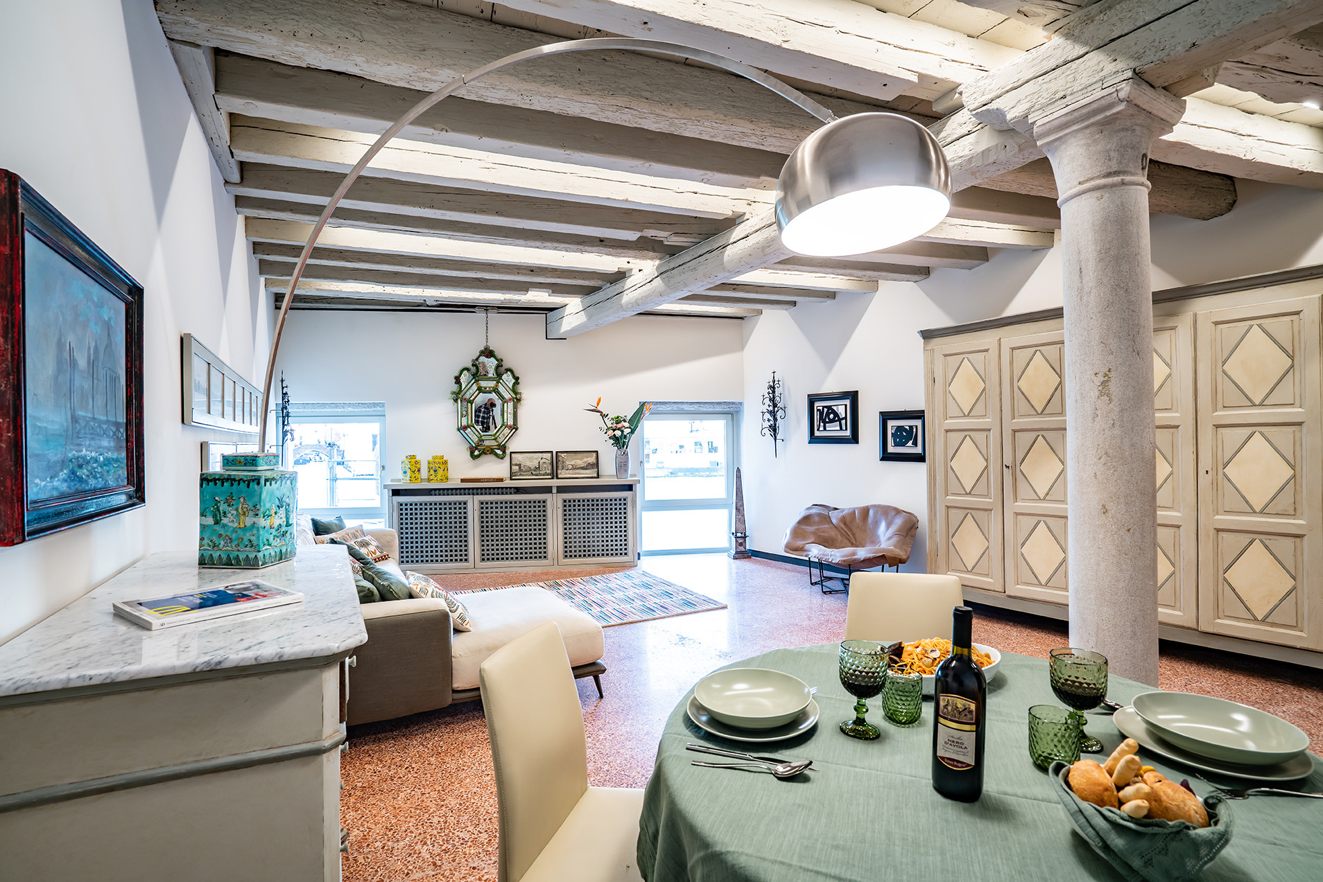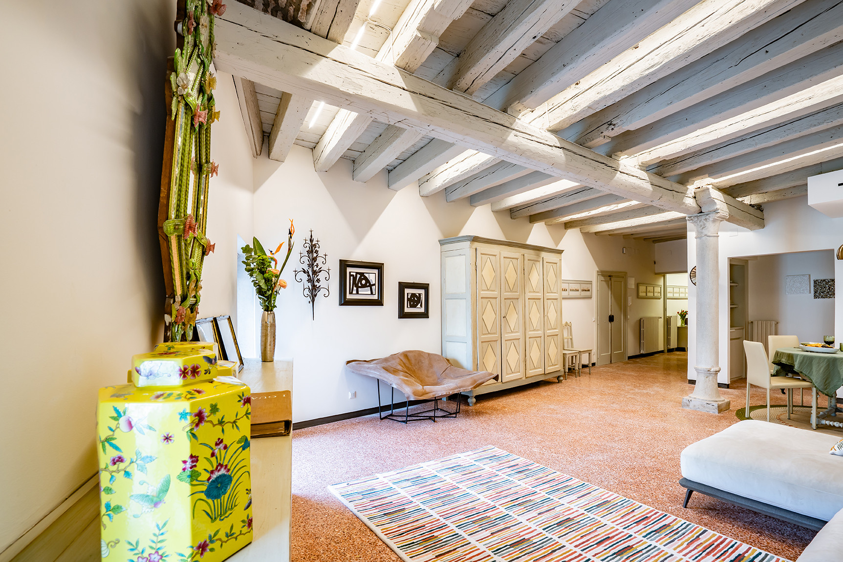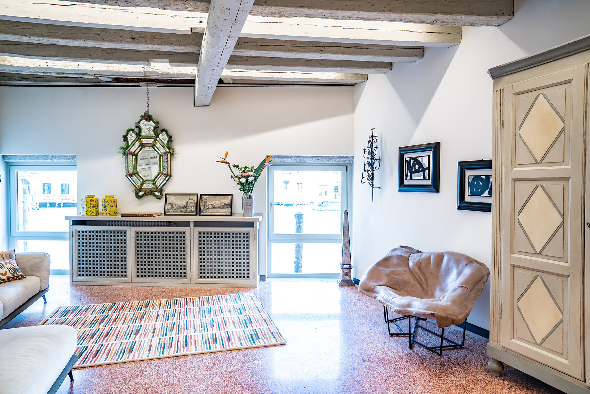 Positioned on an elegant raised ground floor, the apartment welcomes guests into a refined and tranquil setting where classic Venetian charm meets understated comfort. The beautifully arranged living room enjoys picturesque views over the Grand Canal, offering a front-row seat to the gentle rhythm of passing gondolas and water traffic—an ever-changing backdrop that defines the Venetian experience.