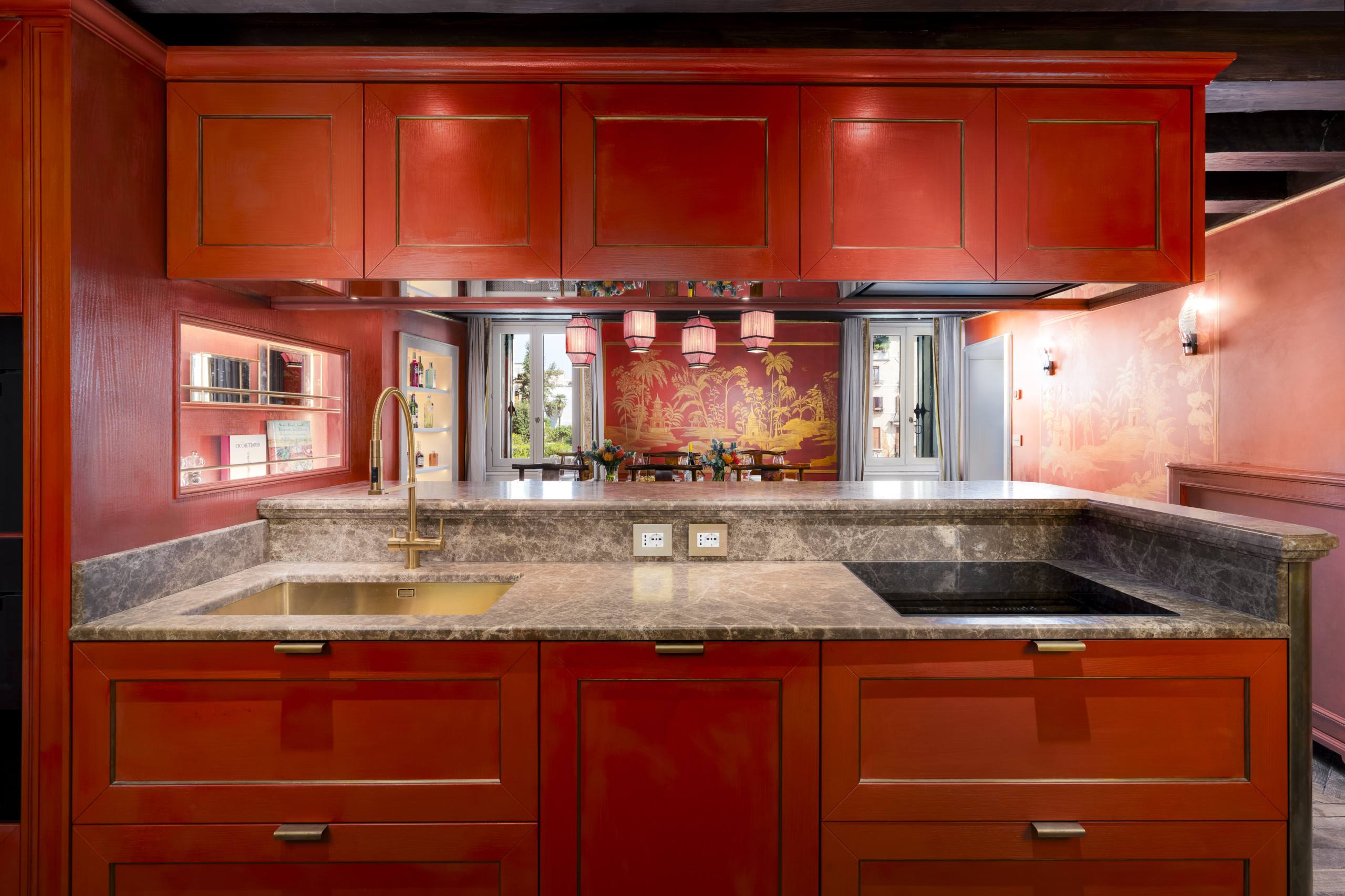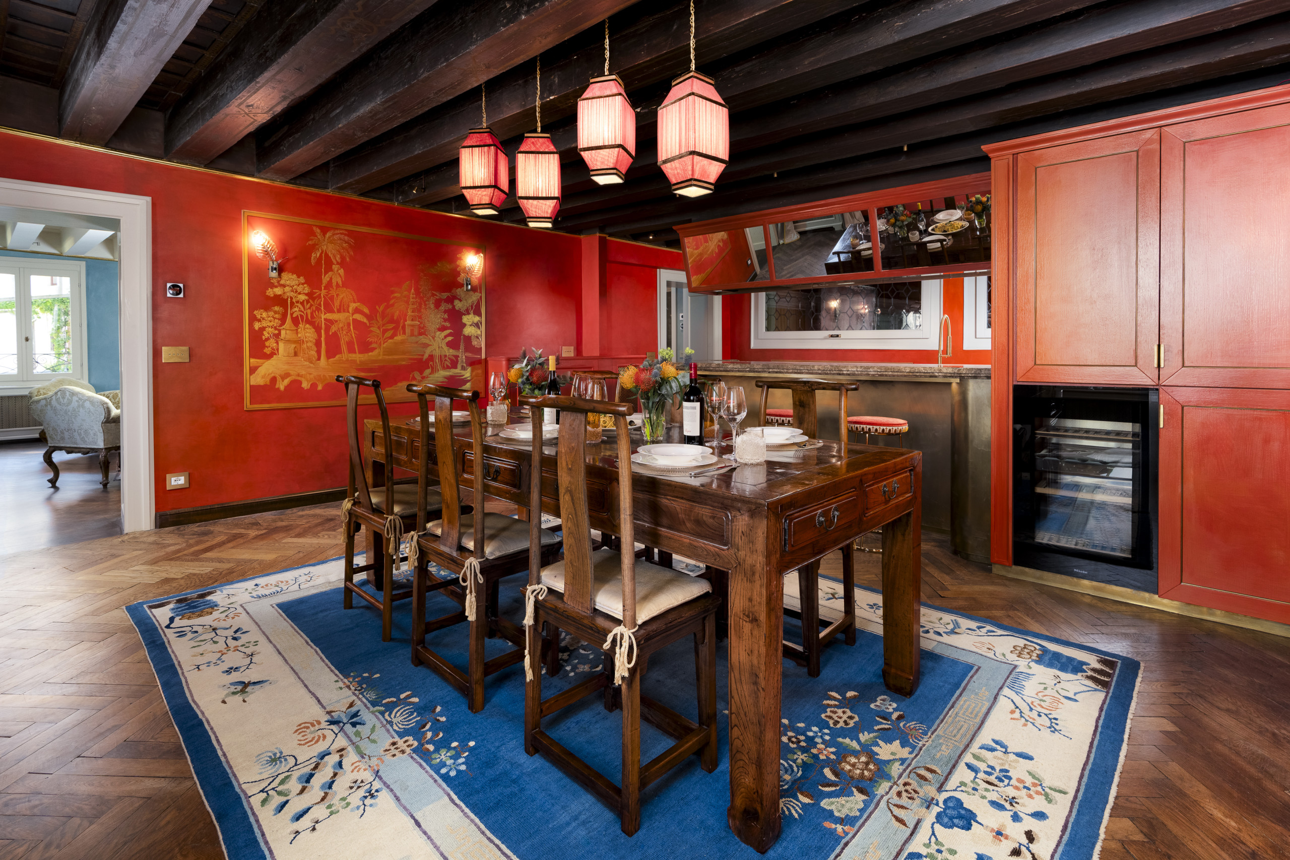 The bold and gloriously bohemian open-plan dining room / kitchen enrobed in a mystical cinnabar red and showcasing a series of delightful Marco Polo-inspired hand-crafted ‘pagoda’ wall-paintings in gold, dark aged timbers above further enhancing the room’s already deeply opulent atmosphere, and a dining suite hosting 8 guests set upon an antique blue and ecru Chinese Peking rug lit softly by a series of pretty, oriental pleated silk lamps