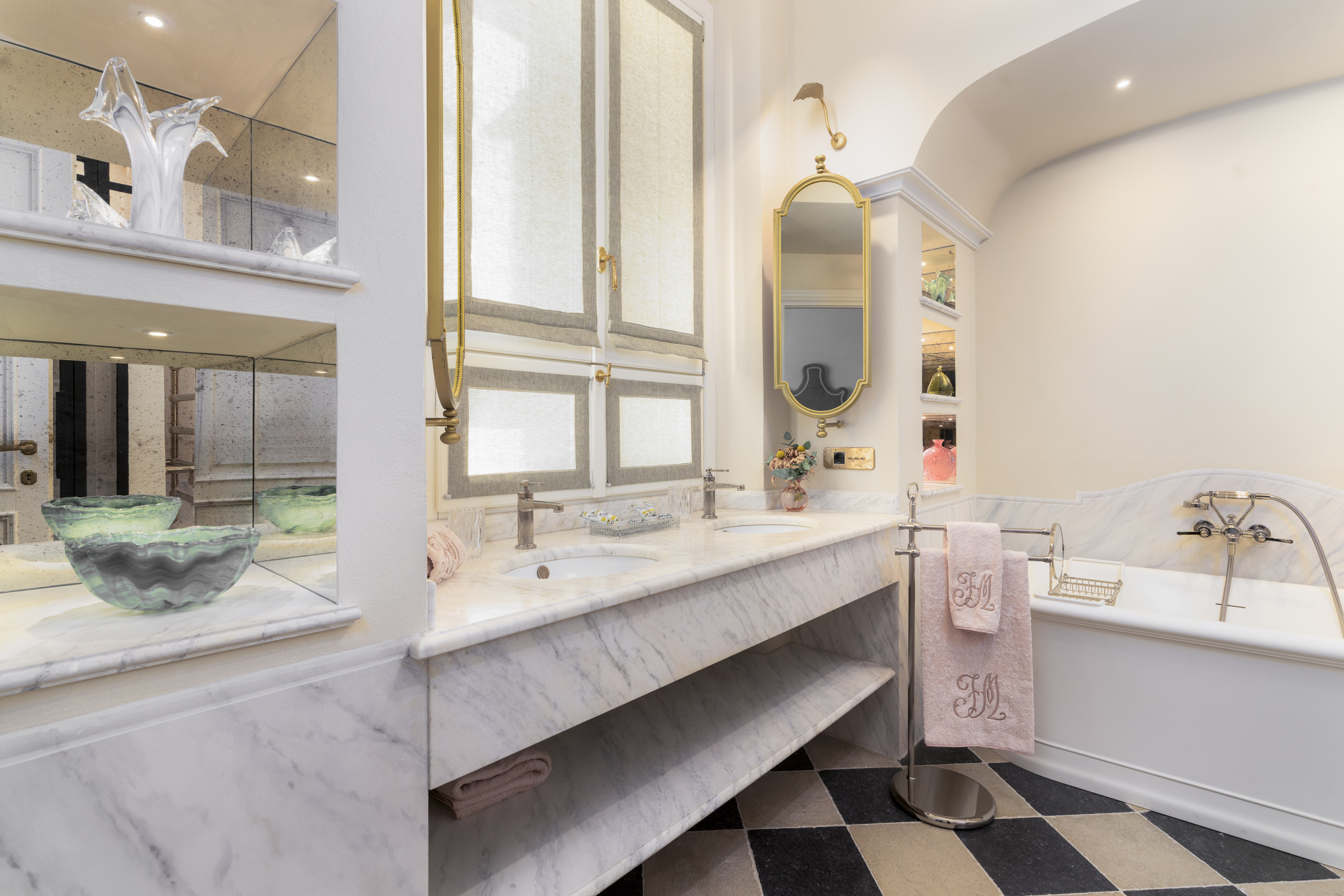A supremely romantic and rather regal principal double with a traditional alcove sitting area, an opulently upholstered double bed, its own walk-in wardrobe, and a spacious and very sweet en suite bathroom in marble with freestanding classical-style bathtub and separate shower