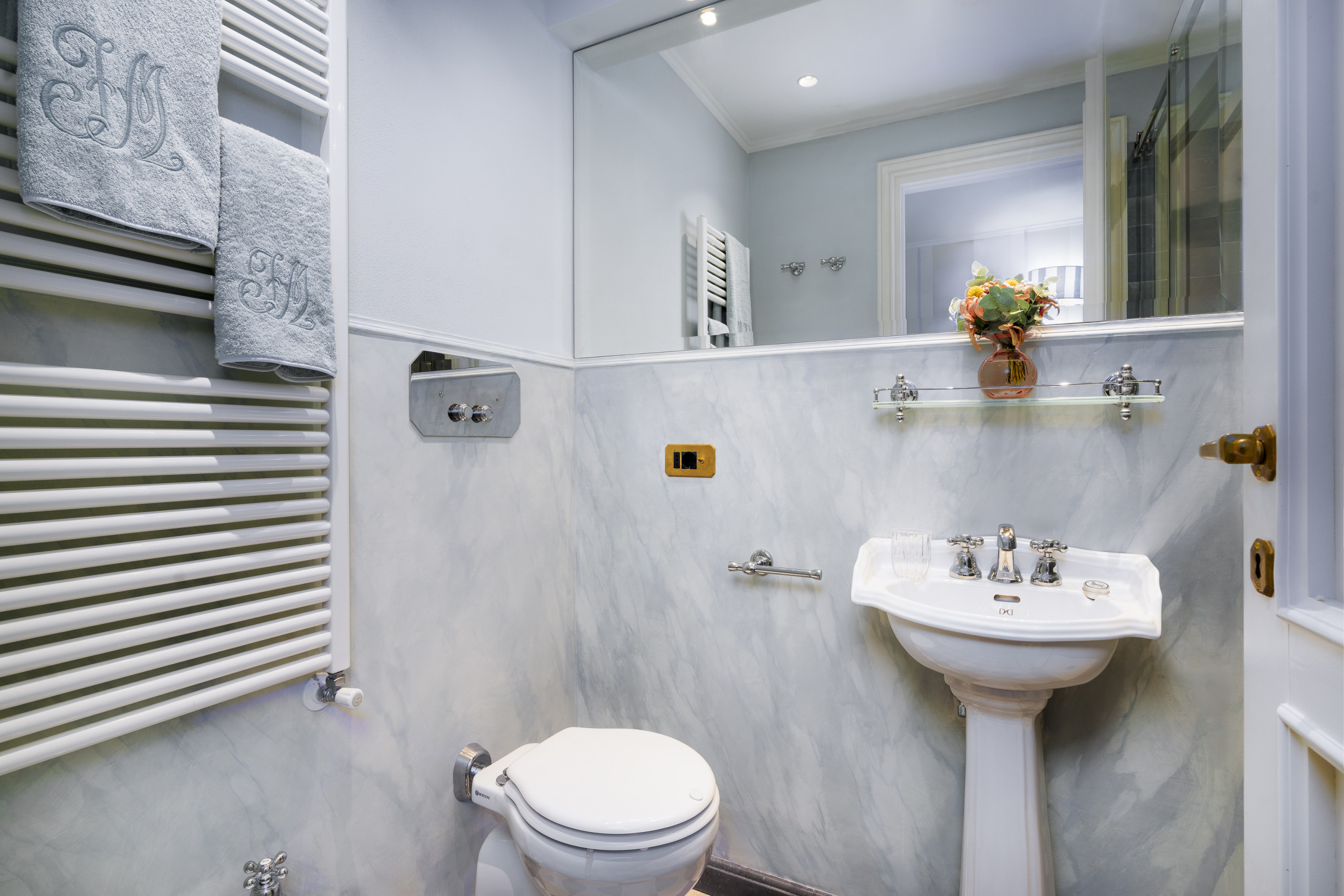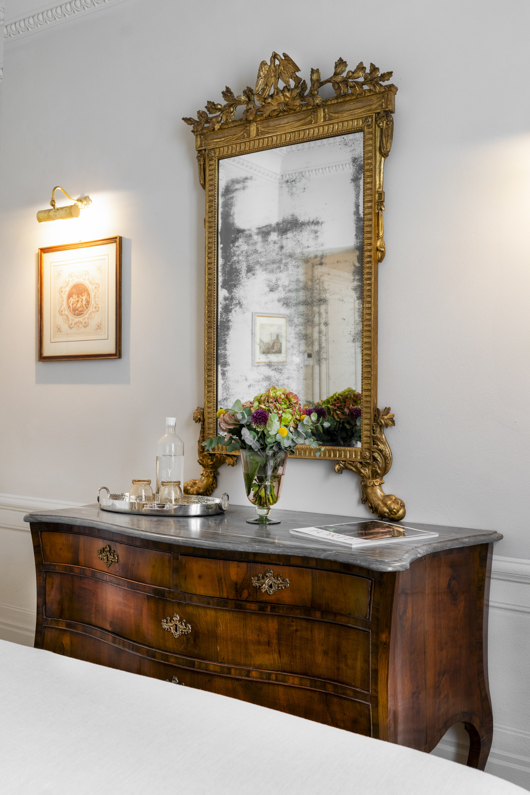 A magnificent dual-aspect main living room with windows facing the piazza (what views!) comprising luxurious sitting / dining areas and showcasing a wonderfully characterful coffered ceiling overhead, warm diamond parquet flooring underfoot, a trio of deep, plush, petrol-blue velvet sofas to cocoon you in comfort, and a dining suite hosting 8 guests set beside a dramatic chiaroscuro painting of ‘Il Rifiuto di Marco Aurelio’ – signed by the late-Baroque Lucchese artist Giovanni Domenico Lombardi, a follower of Caravaggio – all beautifully lit by a marvellous crystal chandelier that shimmers and twinkles as you dine privately ‘at home’
