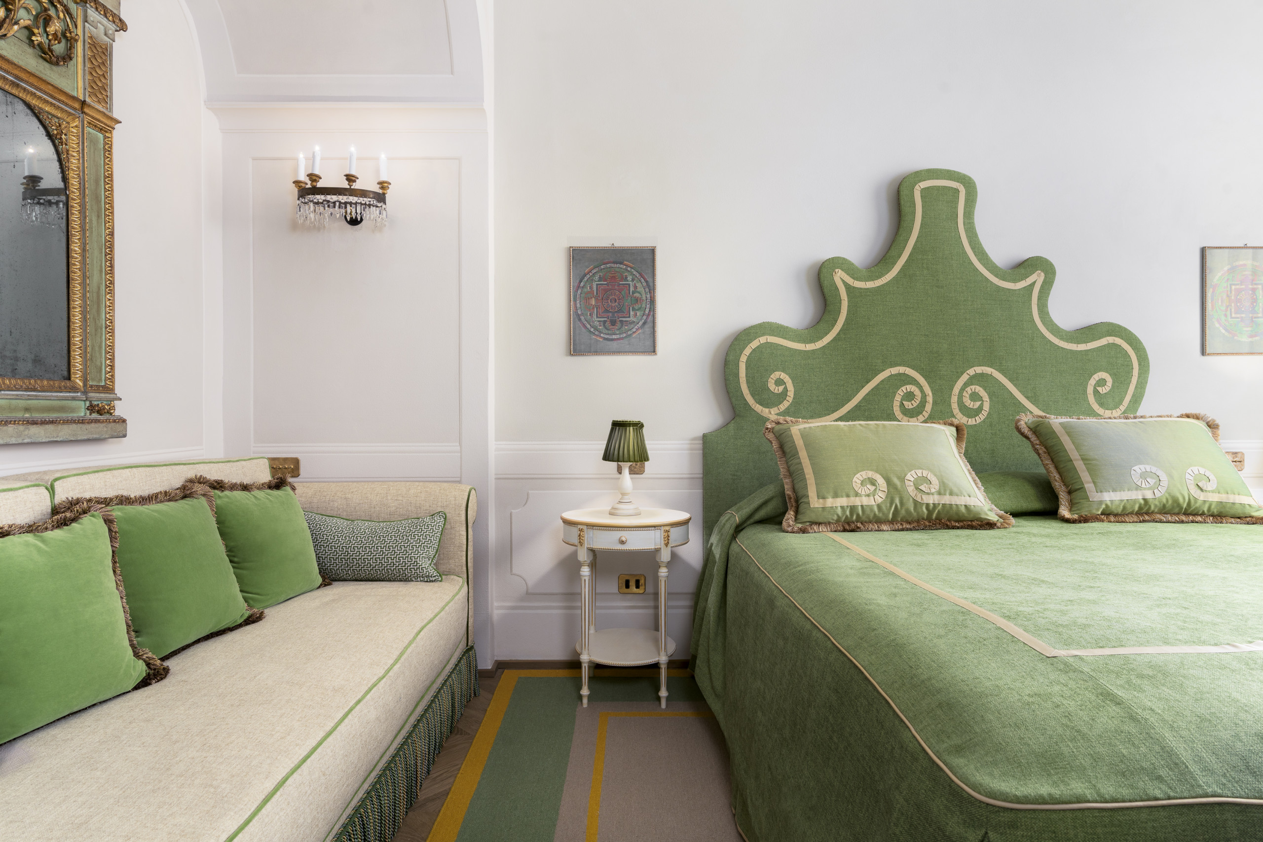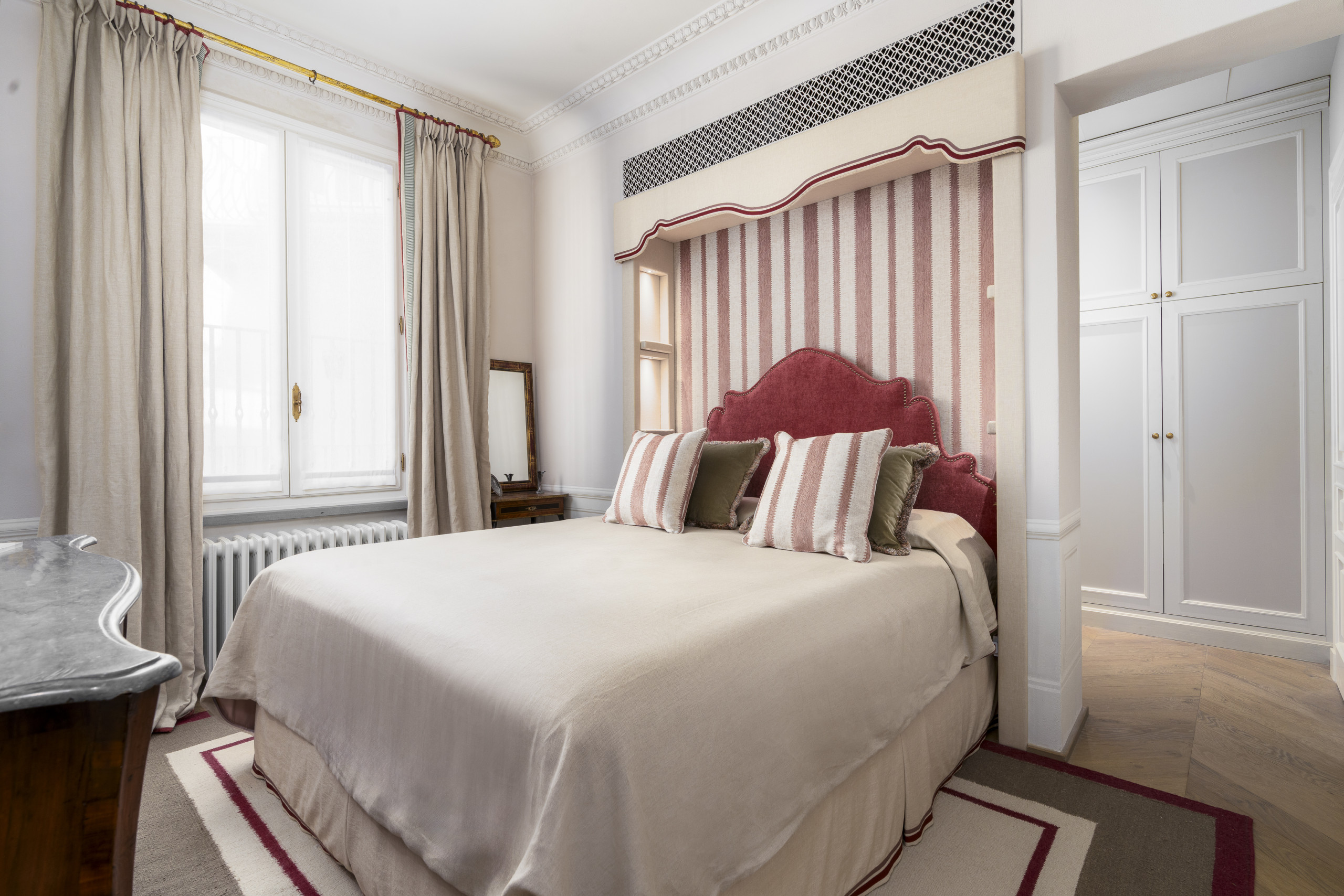 To the rear of the palazzo, a tranquil 3rd double bedroom in ivory and deep pinks with a double bed, an built-in wardrobe and an en suite bathroom with shower in grey and terracotta marble