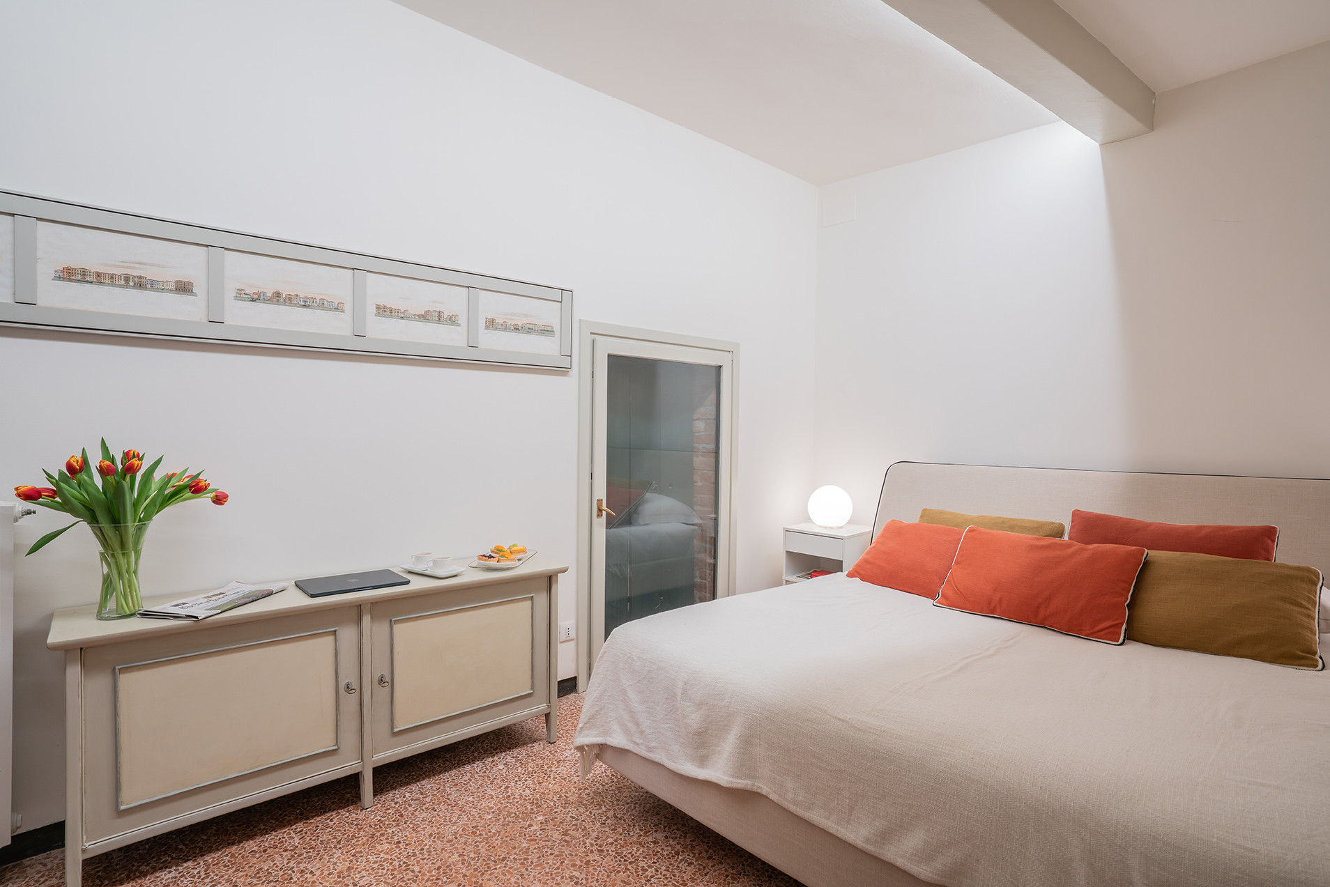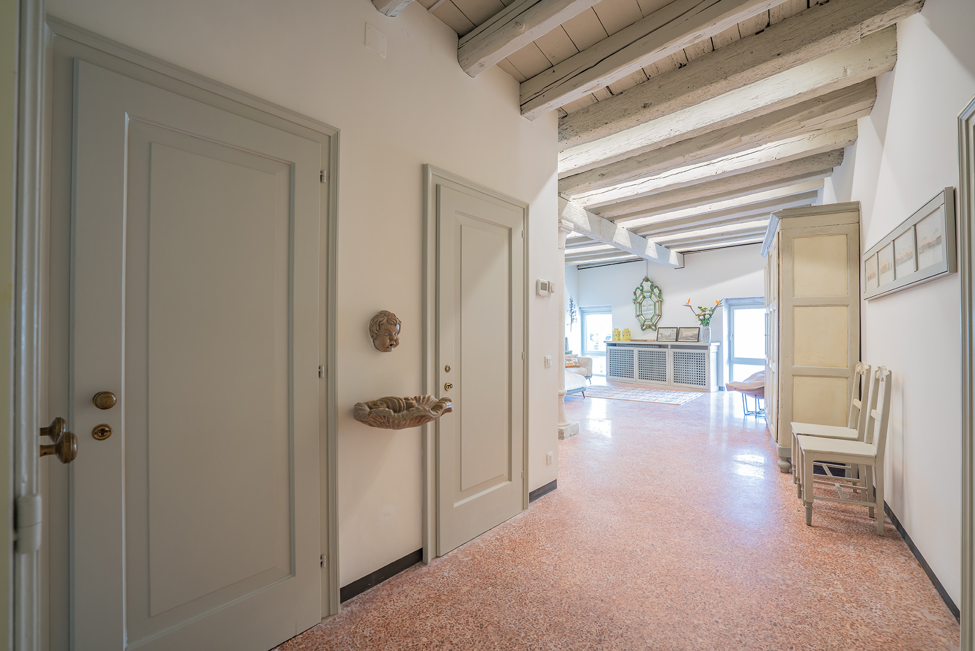 Positioned on an elegant raised ground floor, the apartment welcomes guests into a refined and tranquil setting where classic Venetian charm meets understated comfort. The beautifully arranged living room enjoys picturesque views over the Grand Canal, offering a front-row seat to the gentle rhythm of passing gondolas and water traffic—an ever-changing backdrop that defines the Venetian experience.