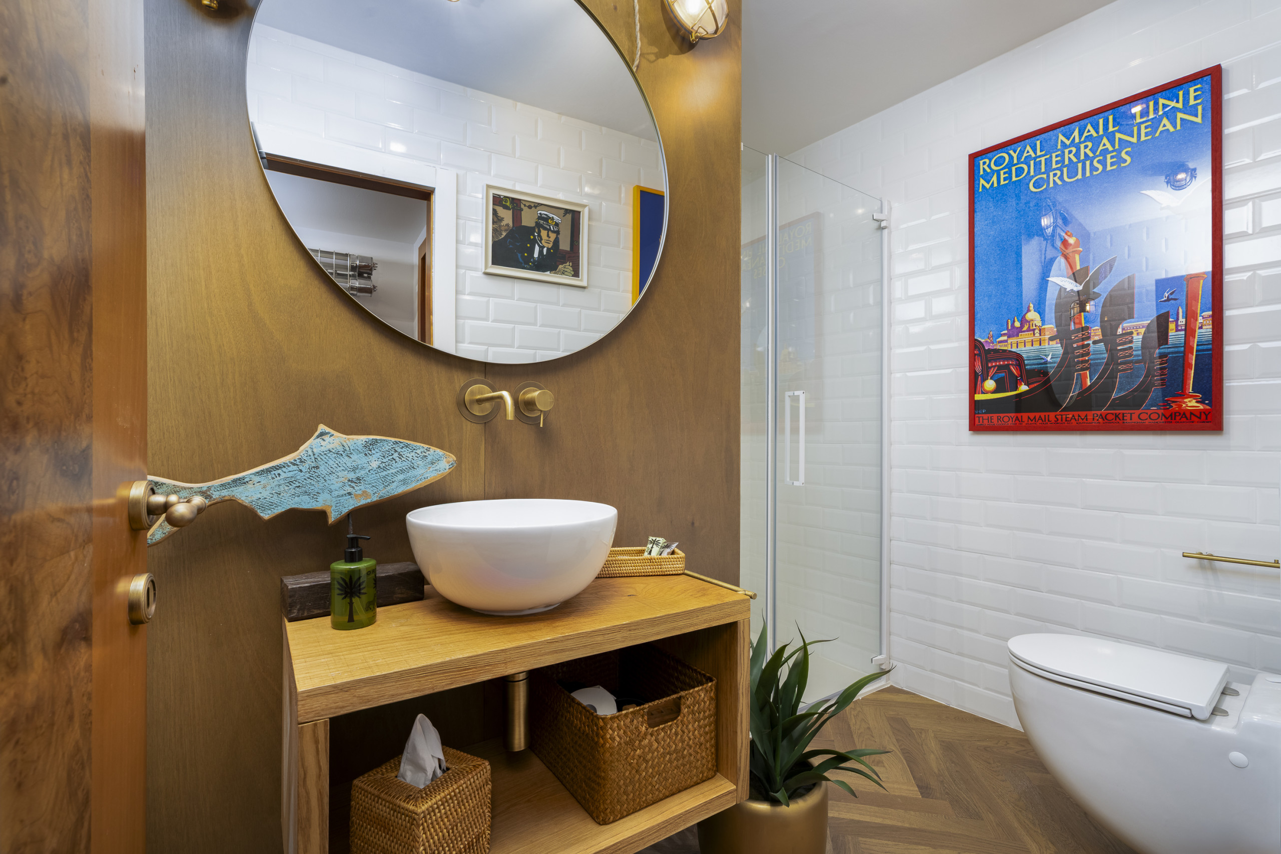• Un bagno per gli ospiti (solo gabinetto e lavandino) con carta da parati Benaki di Lewis & Wood, specchio e luci soffuse.