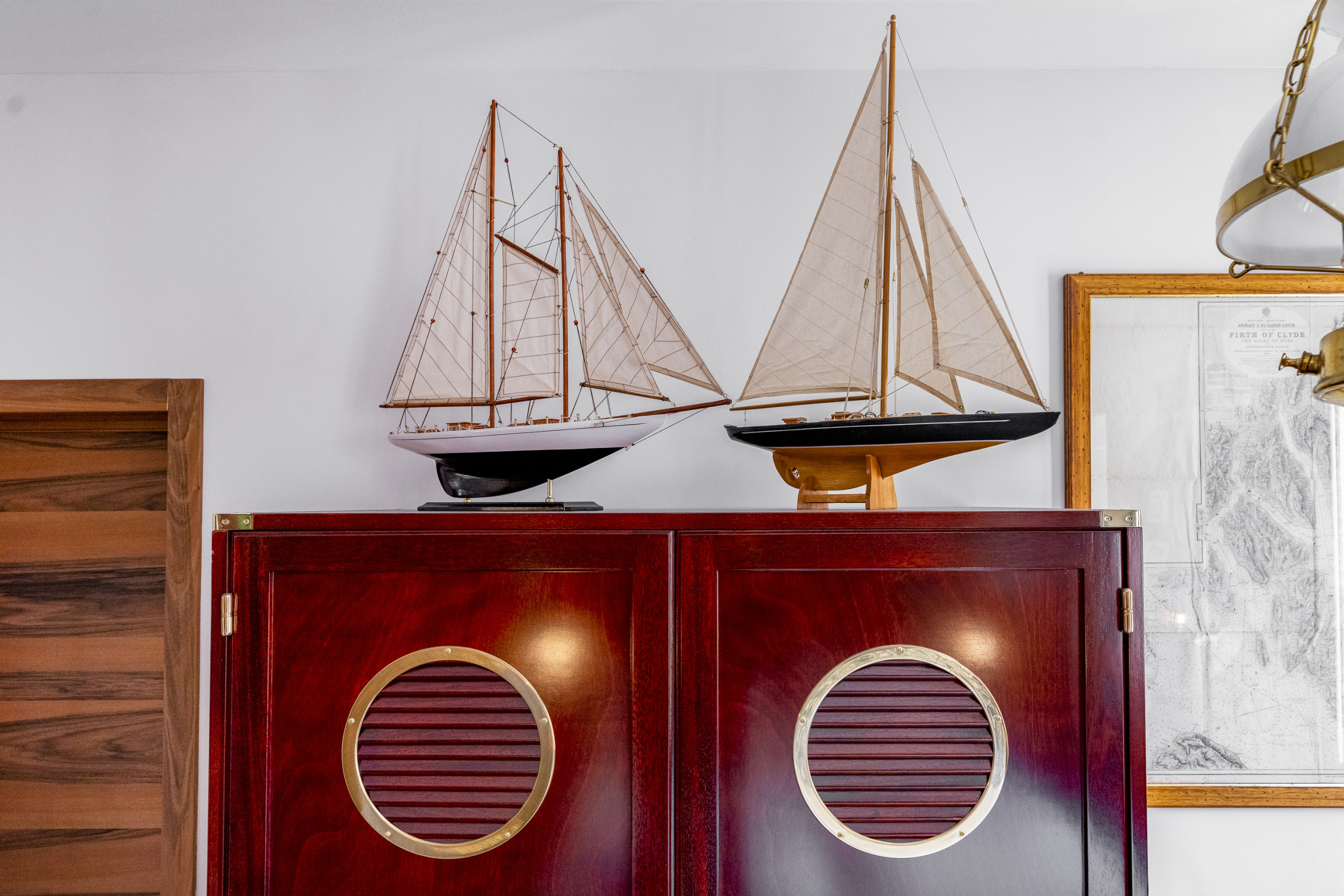 A fabulously bright and sunny lounge room, including a huge sofa for relaxing, a kitchen & bar in traditional Yacht Club style and a beautiful dining space. The entire living space is furnished with warm herringbone parquet flooring underfoot and walls of polished walnut and is replete with a vast collection of fascinating maritime antiques and ephemera including a fleet of model sailing vessels, nautical history books, pictures and wall maps, plus a pair of photographic artworks by celebrated Hollywood cinematographer and photographer Maxime Alexandre from his first Venice exhibition... all lit by an array of antique ships’ lamps casting an atmospheric glow at night