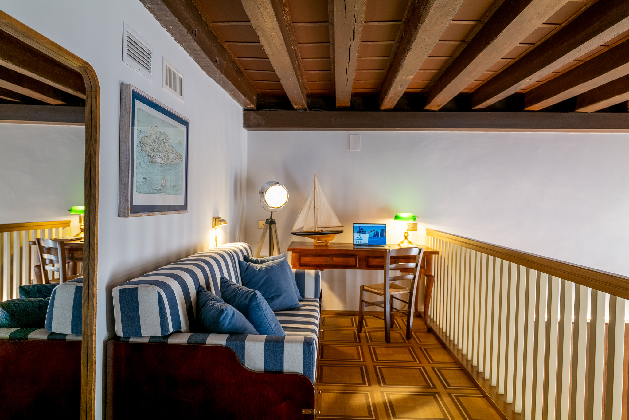 A true charmer of a spacious duplex beamed double bedroom overlooking the canal and the Malibran Theatre to the fore, with a pristine en suite bathroom with a ‘couples’ shower, walls in wood, a maritime map mural drawing the eye and a super king-size Cocomat design bed (200cm x 210cm) beneath the room’s sweet soppalco mezzanine level above which is furnished with writing desk and nautical sofa, which can be used as a single bed sleeping 1