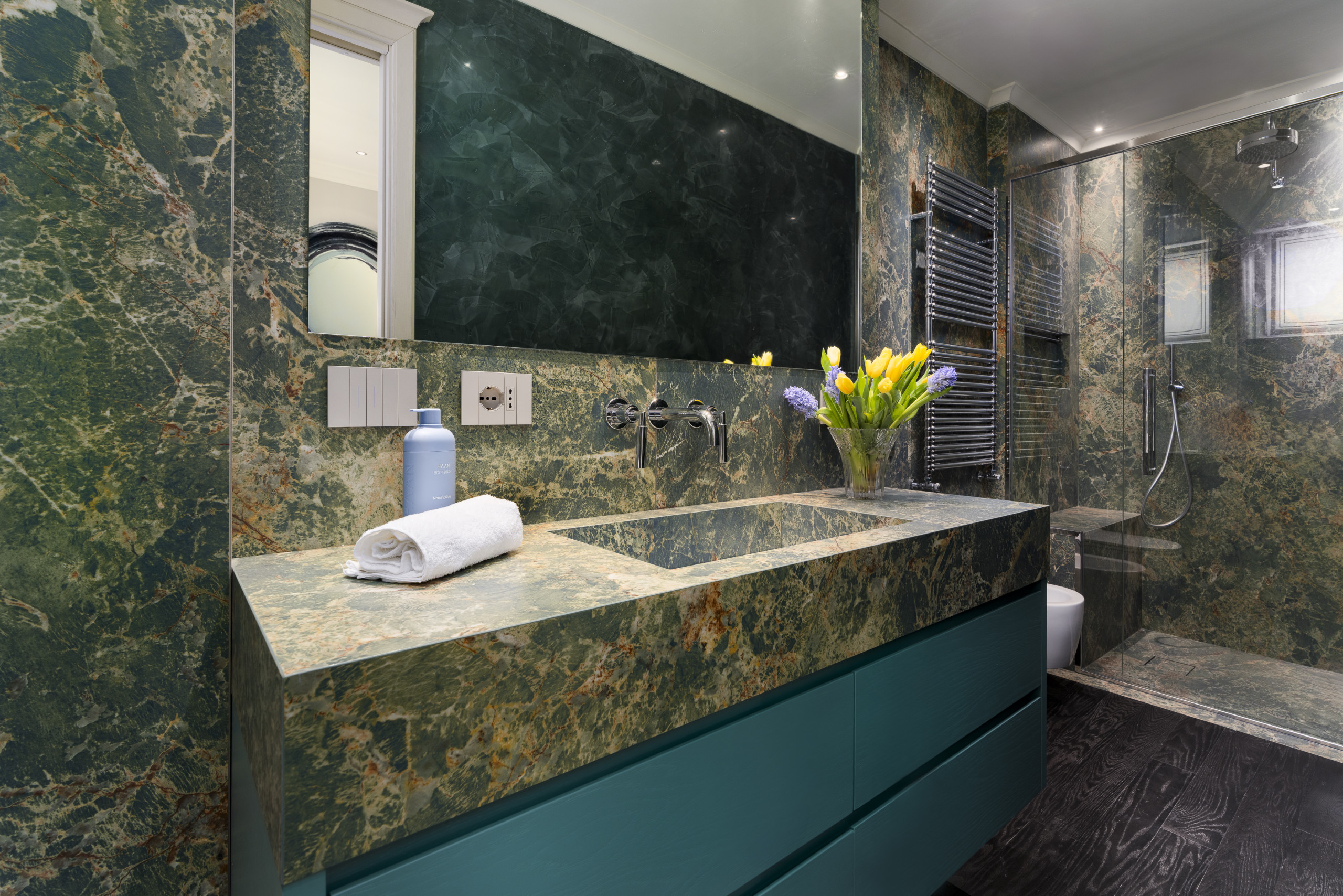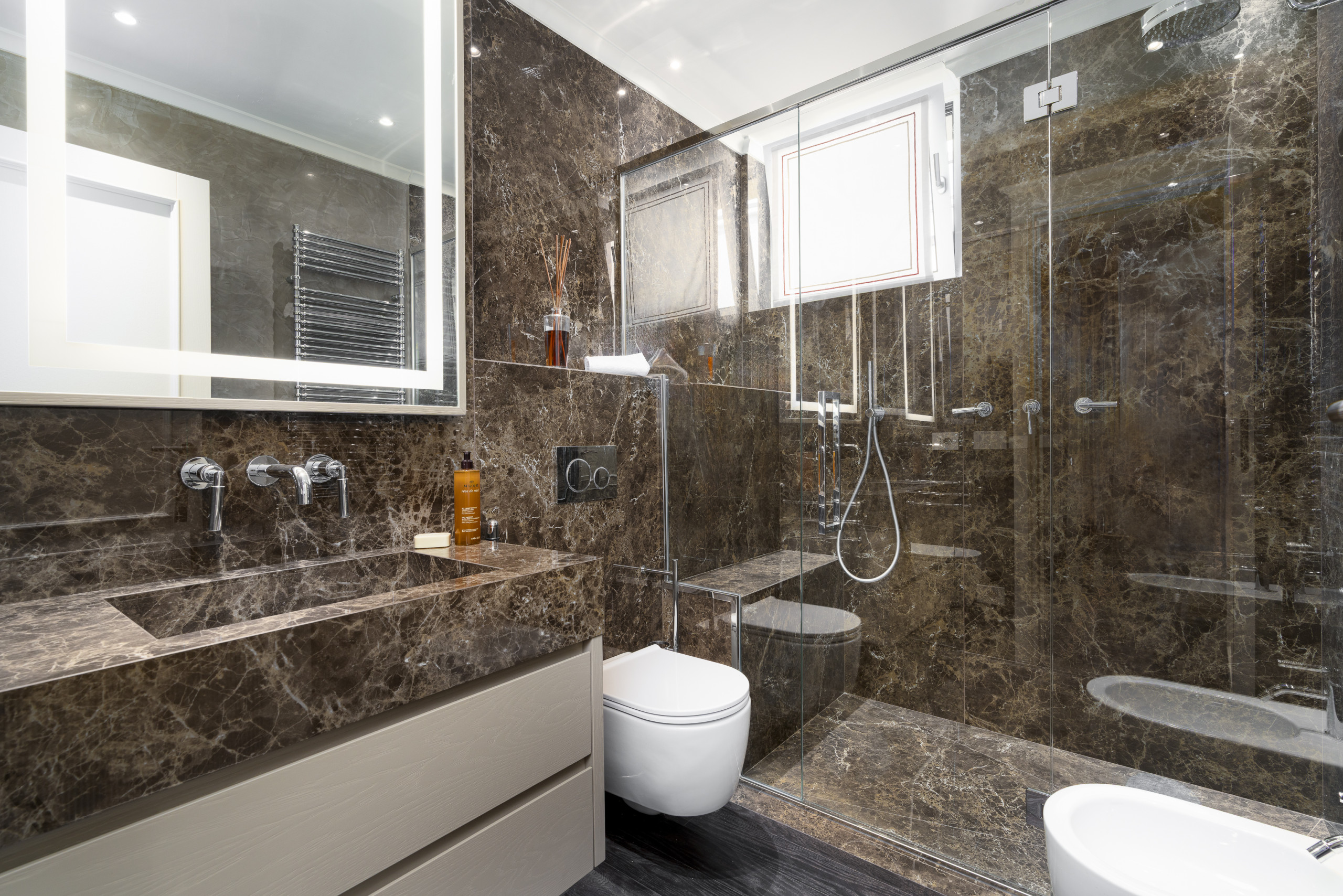 A luxurious bathroom flanked externally by mirrored wardrobes with walls of polished marmorino, burnished brass fittings and, last but not least, a marble-encased shower