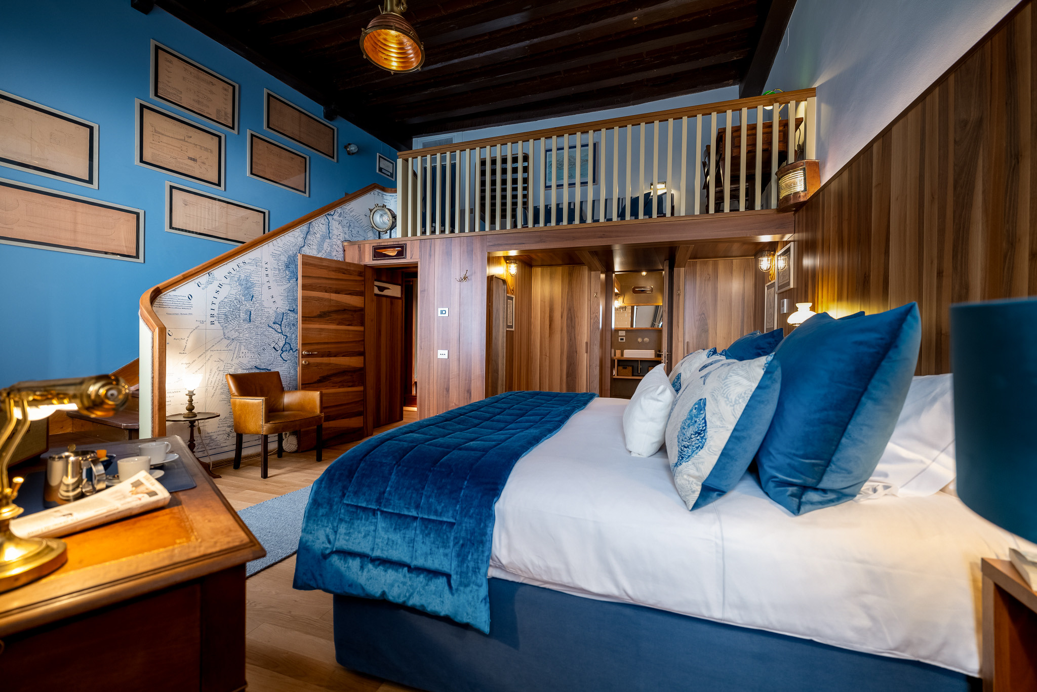 A bright and welcoming double bedroom furnished with a nautical cupboard, a queen-size Cocomat design bed (180cm x 200cm) that can be split into twins at your request, a circular steamship mirror and antique maritime lighting (naturally!) plus a luxurious en suite bathroom with brushed bronze fittings and shower